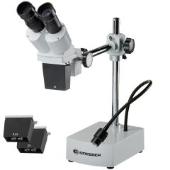 Neben der Verwendung im naturwissenschaftlichen Unterricht eignen sich insbesondere die Stereomikroskope BRESSER Biorit ICD auch für vielfältige Anwendungen in der Industrie. Durch den großen Arbeitsabstand und den Schwenkarm der Stereomikroskope BRESSER Biorit ICD werdend ie Stereomikroskope von Anwendern auch zum Löten, besonders von SMD Bauteilen, eingesetzt. Durch den Schwenkarm ist die Arbeitsfläche unter dem Mikroskopkopf frei, sodass auch größere Bauteile hantiert werden können. Das Stereomikroskope BRESSER Biorit ICD verfügt über zwei zusätzliche Wechselobjektive 0.5x und 2.0x, sodass ein breiter Vergrößerungsbereich mit großem Sehfeld realisiert werden kann. Mit dem 0.5x Objektiv wird ein Arbeitsabstand von 250 mm erreicht. Beim 2.0x Objektiv beträgt der Arbeitsabstand 80 mm. Durch die Schwanenhals LED-Beleuchtung wird eine optimale Ausleuchtung des Objekts gewährleistet.